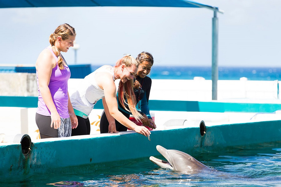 ドルフィン・アロハは園内裏のバックステージプールで、イルカにそっと触れたりエサをあげたりしながら、様々な行動を間近で観察するプログラムです。水の中には入らないので水着に着替える必要がありません。付き添いの方はバックステージに一緒に入ることができませんのでパーク内でお待ちいただくことになります。